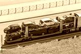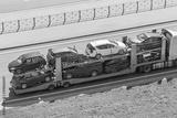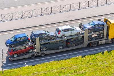 Transportation of new cars on a trailer with a truck for delivery to dealers.
