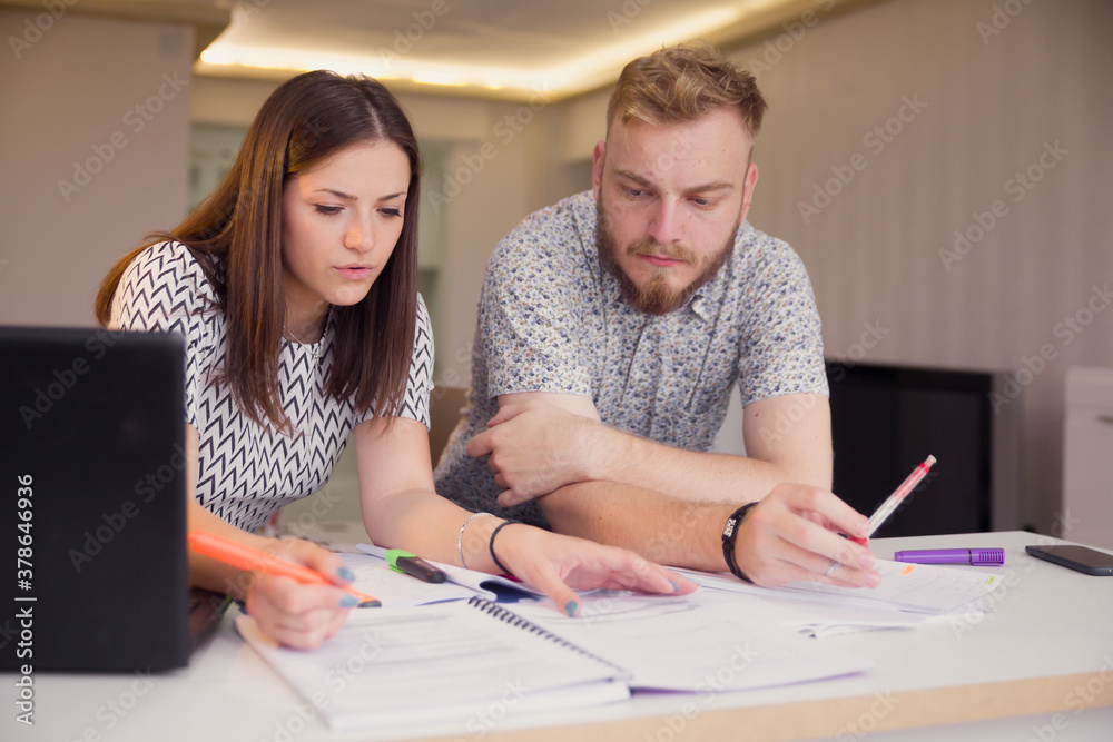 two young people, studying together, sitting in front of notes on a desk.