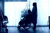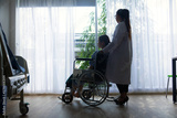 Doctor carrying woman patient on Wheelchair. They are in hospital. disabled person,help. Photo concept depression and Patient.