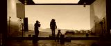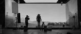 Behind the scenes shot of virtual production stage with huge LED screens, cinematorgapher shooting Mars scene. Future of movie production