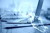 Desktop computer background in office and start up theme hologram drawing. Double exposure. Startup concept.