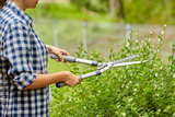 gardening and people concept - woman with pruner or pruning shears cutting branches at summer garden
