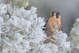 Peregrine Falcon, bird of prey with snow sitting on the white rime pine tree, dark green forest in background, action scene in the nature tree habitat, Germany, Europe.