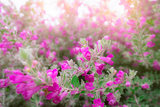 Pink flower in the morning with sunlight. Selective focus pink flower with green leaves on blurred bokeh background of ornamental plant in the park or backyard. Love and romantic background. Nature.