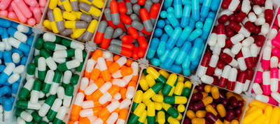 Top view of colorful capsule pills in plastic box. Antibiotic drugs, painkiller medicine, vitamins, and supplements capsule pills. Pharmaceutical industry. Infections. Capsule pills production.