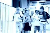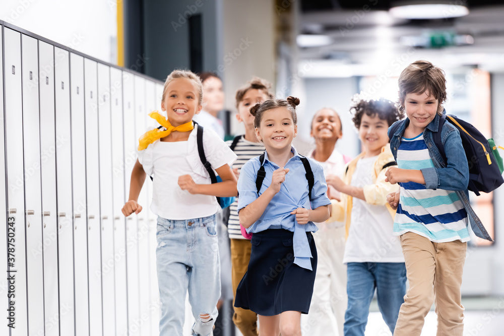 selective focus of excited multicultural classmates with backpacks running along school corridor