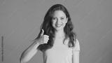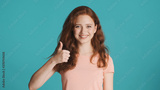 Pretty cheerful girl happily showing thumb up gesture on camera over colorful background. Well done expression