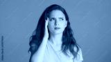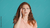 Portrait of tired girl showing headache on camera over colorful background