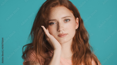 Beautiful upset girl showing headache tiredly looking in camera over colorful background