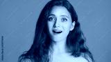 Attractive excited girl amazedly looking in camera over colorful background. Wow expression