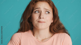 Upset worried girl guiltily looking away over colorful background