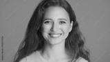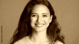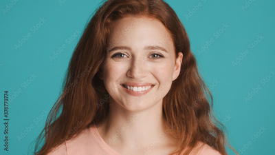Pretty cheerful girl happily looking in camera and smiling over colorful background