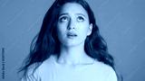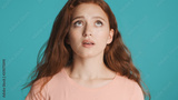 Portrait of pensive girl thoughtfully looking up over colorful background