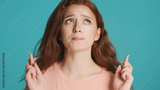 Portrait of worried girl with crossed fingers hopefully praying on camera over colorful background. Please expression