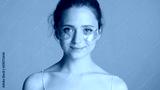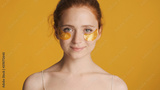 Beautiful smiling girl in eye patches intently looking in camera over colorful background. Beauty concept