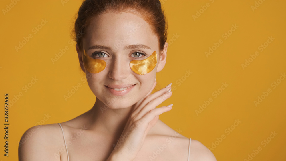 Beautiful smiling girl in eye patches confidently posing on camera over colorful background