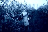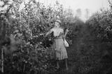 Blonde girl in tender dress and straw hat with white basket up picking red apples from an apple tree on a lovely sunny summer day.