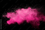 Pink powder explosion on black background. Colored cloud. Colorful dust explode. Paint Holi.