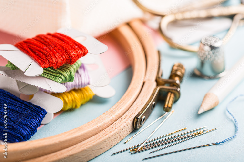 Embroidery set fot cross stitching. White fabric, embroidery hoop, colorful threads, scissors and needls. On blue background. Hobbies concept.