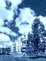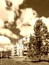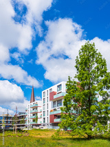 Moderne Gebäude und Petrikirche in der Hansestadt Rostock