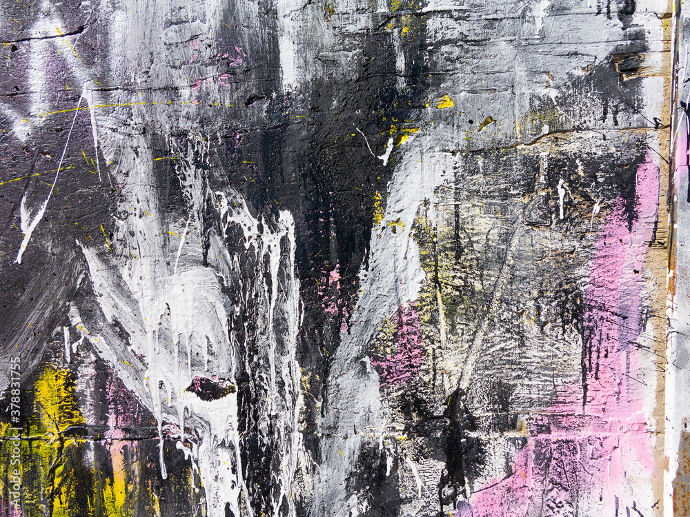 Rough paint dripping, spray paint artwork. Abstract background oil paint painting style. Damage to walls with many colors. Rough concrete surface with cracks, scratches and paint stains