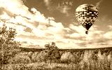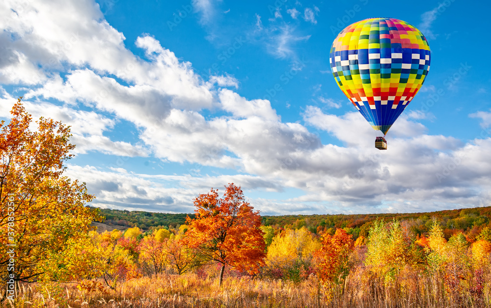 Amazing view of colorful autumn trees with hot air balloon. Concept for fall background. Artistic picture. Beauty world.