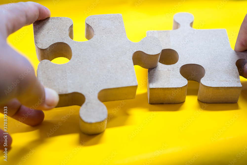 jigsaw puzzle pieces for teamwork on yellow paper background, teamwork put pieces together to connect cooperation. Business team work solutions in success or strategy concept