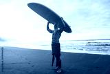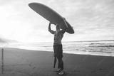 Tattooed senior surfer holding surf board on the beach at sunset - Happy old guy having fun doing extreme sport - Joyful elderly concept - Focus on body
