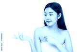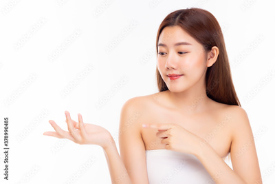 Beautiful Asian spa woman showing empty copy space on beauty open hand palm for text. Beauty spa girl with perfect skin portrait. Proposing some product. Gesture for advertisement. white background