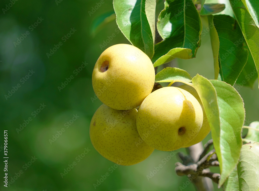 close up on yellow Asian pear on the tree
