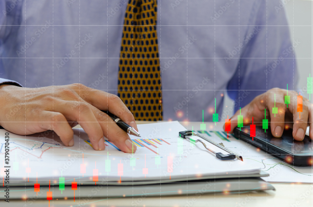 Business man holding pen, business documents, reports, graphs and charts of financial statements and profit growth.Stocks Exchange Market Graph Concept.