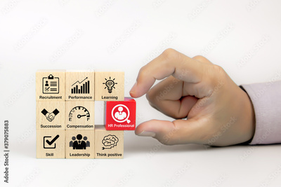 Close up hand choosing people in a magnifying glass icon on cube wooden toy blocks stacked concepts human resources management and HR professional.