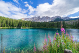 Carezza lake with purple flowers (Lago di Carezza)Dolomites, Alps. South Tyrol. Italy