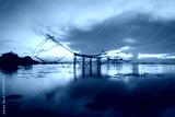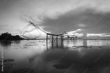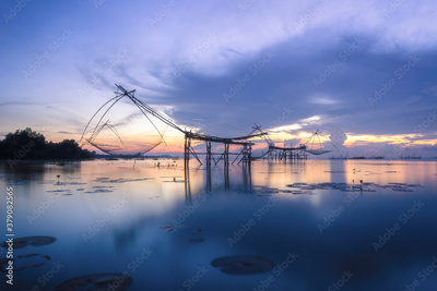 Scene of beautiful sunrise in the morning and giant square dip net at Pakpra village, Phatthalung, Thailand