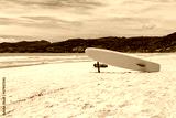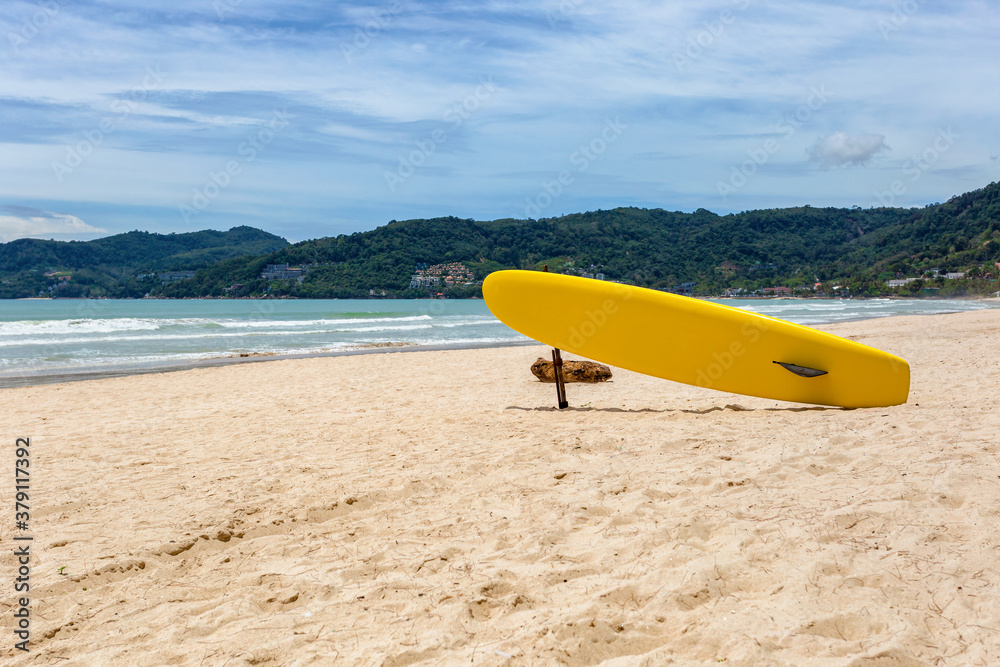 Yellow surfboard on the beach with mountain at Patong Beach, Phuket, Thailand
