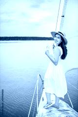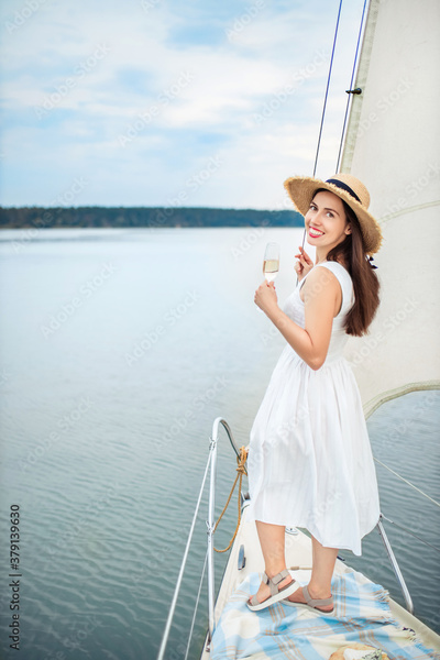 woman with glass of champagne resting on boat