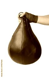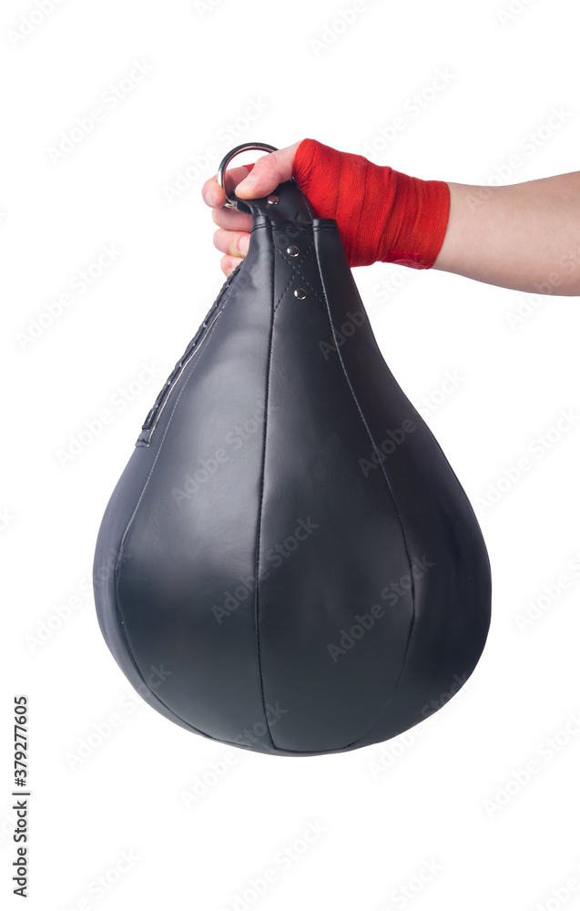 Boxing shell in hand, hanging pear, on a white background, close-up