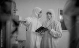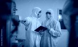 Technician worker wearing protective suite , glove are inspect machine with check face mask manufacturing process to safe and against from virus