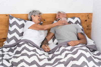 Happy senior wife touching her husband hairy beard - Mature people couple having fun together - Joyful elderly lifestyle - Focus on faces