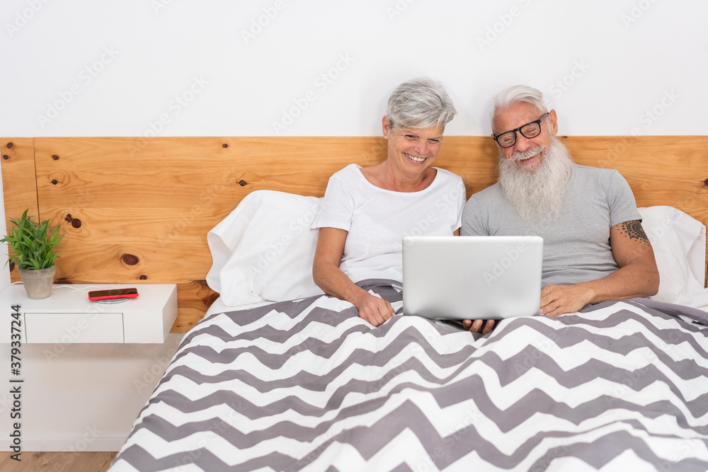 Happy married senior couple lying in bed watching videos on laptop - Mature people having fun at home - Technology elderly love and happiness concept - Focus on faces