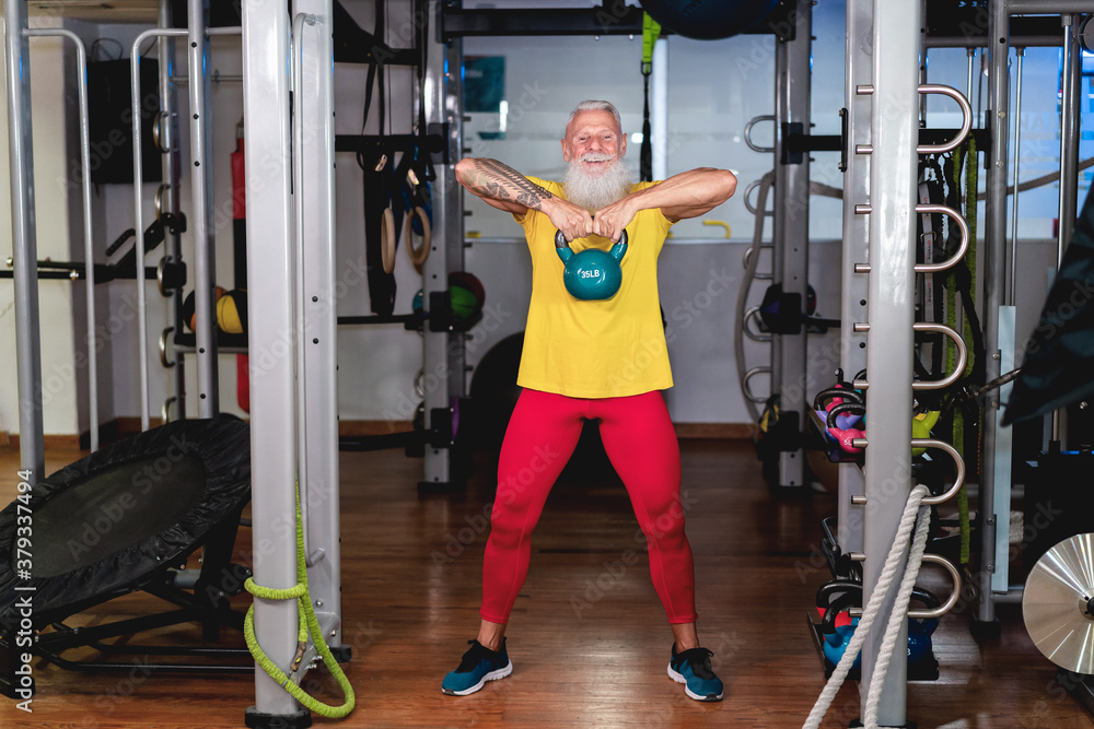 Senior hipster lifting a kettlebell at the gym - Elderly fitness sport and healthy lifestyle - Mature bearded man having fun doing workout in sport fitness club - Focus on face