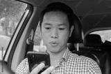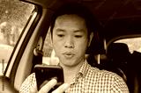 Asian man wearing a plaid shirt looks at smart phone in a car.