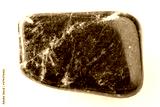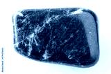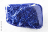 closeup of sample of natural mineral from geological collection - tumbled Sodalite rock on white marble background from Brazil