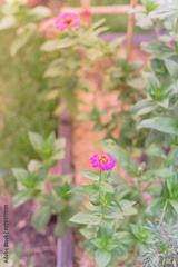 Single purple zinnia flower blossom at organic backyard garden near Dallas, Texas, USA