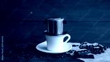 White cup of coffee with a metal filter on a top and scattered beans on a wooden table. Traditional vietnamese coffee.