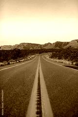 Sunset road with yellow lines in Joshua tree forest. Road to Grand Canyon West national park, Arizona