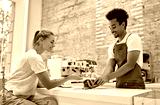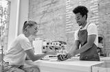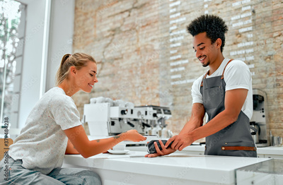 Female customer making payment through mobile phone at counter in cafe with young man. Barista holding credit card reading machine in front of female costumer with cell phone.