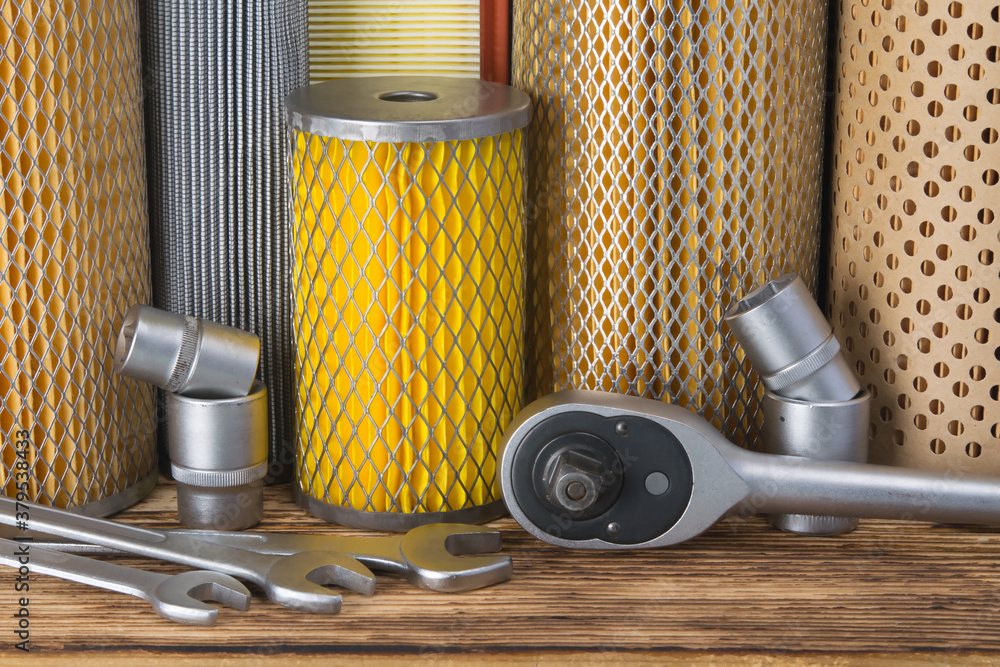 close-up of a set of filters to protect the environment from diesel exhaust, trucks and keys for service