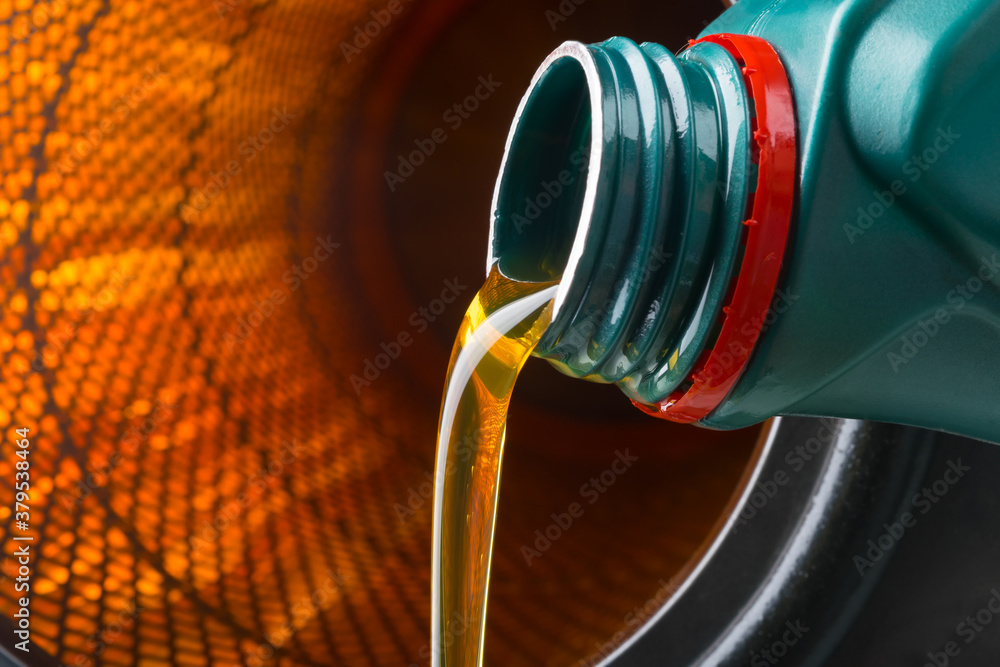 against the background of a burning filter, engine oil is pouring from the neck of the bottle into the engine, close-up