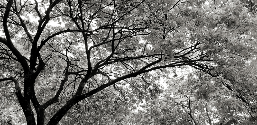Beautiful branch of tree with green leaves for background at park garden in black and white tone. Beauty of nature, plant growing and Natural Wallpaper concept